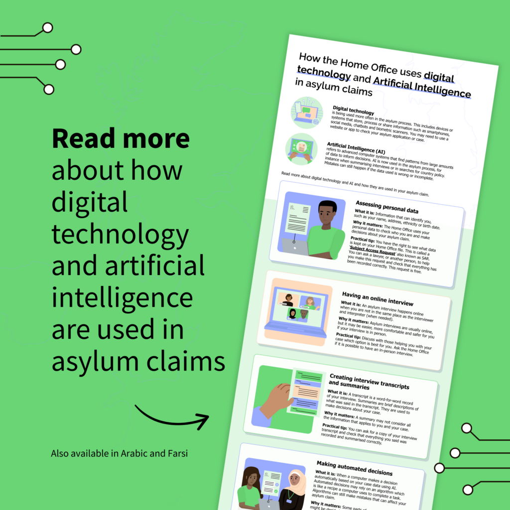 During 6-months we engaged people with lived-experience and professionals in the asylum system to learn more about their view on the opportunities and challenges of the use of such technologies.  We also learned that people’s understanding of digital technology and AI is hugely varied and we hope the infographic will be widely shared to help people understand how digital technology and AI are being used and provide practical steps.